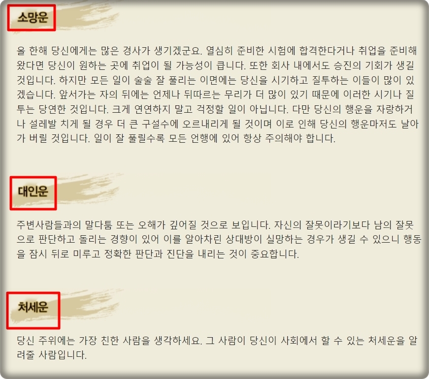 앞서 언급한 바와 같이 토정비결을 통해 여러 가지 요소에 따라 집중적으로 나의 운세를 알아볼 수 있습니다. 연애, 직장, 건강, 소망, 대인, 처세에 관련하여 궁금한 요소를 집중적으로 확인해 보세요.
