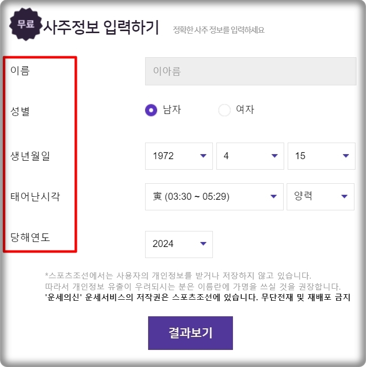 토정비결을 보기 위해서는 몇 가지 정보를 입력해야 하는데요. 이름, 성별, 생년월일, 태어난 시각을 정확하게 입력해 주세요. 당해연도 부분에 있어서는 2024년 이전이나 이후도 선택이 가능합니다. 내년(2025년)에 펼쳐질 나의 운명이 궁금한 분들은 당연히 연도를 2025년으로 변경해 보세요. 그럼 모두 입력했으면 결과 보기 버튼을 눌러 주세요. 가장 먼저 서주명식과 오행 분석 결과가 나타납니다. 상세한 풀이는 나오지 않기 때문에 오행이 어떤 분포로 되어 있는지 정도만 확인해 주세요.