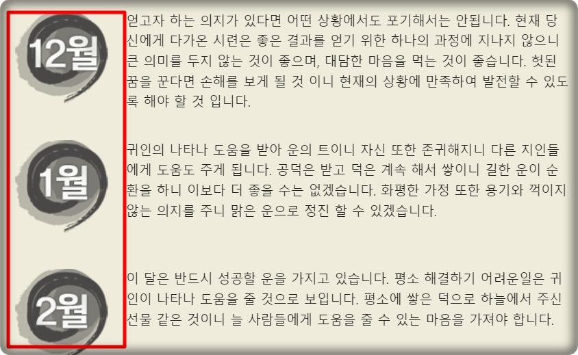 토정비결 풀이에서 가장 중요한 것은 올해의 종합운입니다. 2024년 한 해 동안 어떤 일이 나에게 닥칠지 알려 주는 것인데요. 이것을 통해 앞으로의 인생을 긍정적으로 바라보고, 조심해야 할 것들이 있으면 주의하면 됩니다. 종합운과 함께 월별 세운을 확인할 수 있는데요. 매월마다 어떤 일이 펼쳐질지 바로 알 수 있어요.