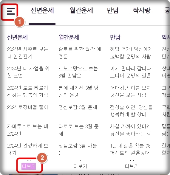 사이트에 접속하면 좌측 상단에 있는 전체 메뉴 버튼을 눌러 보세요. 그 다음 신년운세 카테고리에서 "더보기" 버튼을 눌러줍니다. 그럼 좌측 하단에 무료 운세 순위가 나타나는데요. 여기에서 세 번째에 있는 토정비결을 마우스로 클릭해 주세요. 이외에도 궁합이나 사주를 보고 싶은 분들은 무료 인기 순위에서 선택하면 됩니다.