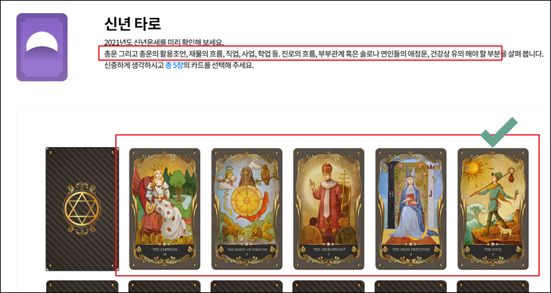 저는 올해 2021년 신년운세를 알아볼 수 있는 "신년 타로"를 선택했어요. 타로점을 통해 2021년 총운은 물론이고, 운의 활용 및 조언, 재물, 건강, 애정, 진로 등을 알아볼 수 있다고 해요.